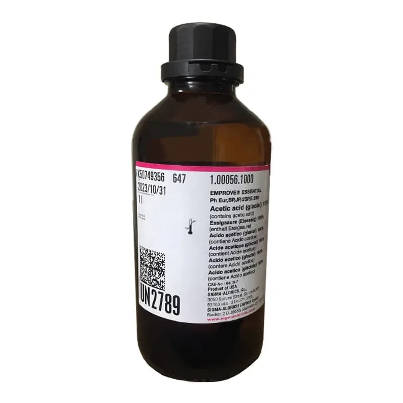 استیک اسید کد 100056 حجم 2.5 لیتر مرک آلمان، ترکیب آلی با فرمول مولکولی (CH3COOH) یکی از مهمترین ترکیبات کربوکسیلیک اسیدها میباشد.این ترکیب مایعی بی رنگ و با بویی شبیه به سرکه میباشد که قدرت خورندگی بسیار بالایی دارد و به راحتی در آب حل می شود. همچنین در تتراکلرومتان، اتانول، اتر و استون نیز حلالیت مناسبی دارد.استیک اسید به دو صورت مصنوعی و طبیعی(توسط باکتری) تولید می شود.محلول رقیق استیک اسید توسط تخمیر و اکسید شدن کربوهیدرات های طبیعی تشکیل میشود که به آن سرکه می گویند.کاربردهای اسید استیک: