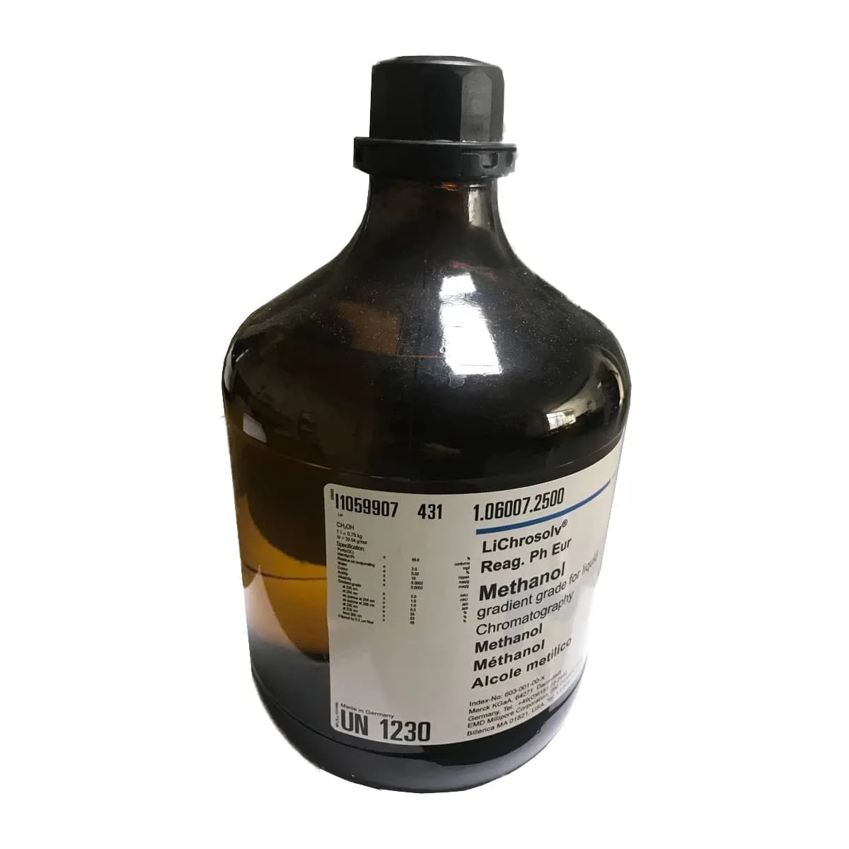 متانول 2.5 لیتری مرک آلمان کد 106007، متانول گرید پور آنالیز مرک آلمان یکی از بهترین و با خلوص بالاترین متانل های موجود میباشد که در آزمایشگاههای تحقیقاتی و کنترل کیفی جهت حلال سازی و شستشوهای دستگاههای خاص آزمایشگاهی استفاده میگردد.این محصول بهتر است اگر در مدت زمان بیشتری برای نگهداری استفاده مینمائید در ظروف شیشه ای خریداری شود. زیرا همه در برابر نور حساسیت بالایی دارد هم نگهداری متانول در شیشه های کهربایی بهتر از ظروف پلاستیکی شفاف است. این محصول در بسته بندی های 1 لیتری و 2.5 لیتری و 25 لیتری موجود می باشد. همانطور که میدانید این محصول بسیار سمی و قابل اشتعال است که دستورات لازم در قسمت نگهداری و ایمنی محصول توضیح داده شده است.خصوصیات ظاهری :